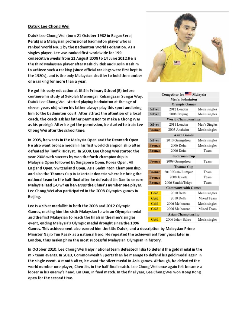 Ini merupakan nama orang dalam bahasa Cina. Pemain badminton perseorangan negara Pendidikan. BIODATA DATUK LEE CHONG WEI Nama Penuh.
