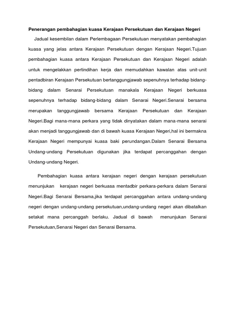 Penerangan Pembahagian Kuasa Kerajaan Persekutuan Dan Kerajaan Negeri Pdf