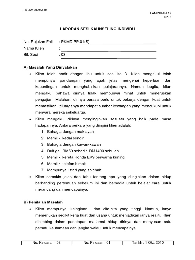 11 laporan kajian kes. LAPORAN SESI KAUNSELING INDIVIDU UNIT KAUNSELING OPEN UNIVERSITY KUALA LUMPUR KAUNSELOR. Keselamatan dan kebajikan kaunselor dan klien dapat dijaga sekiranya laporan sesi ditulis dengan baik.