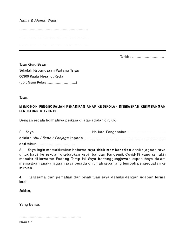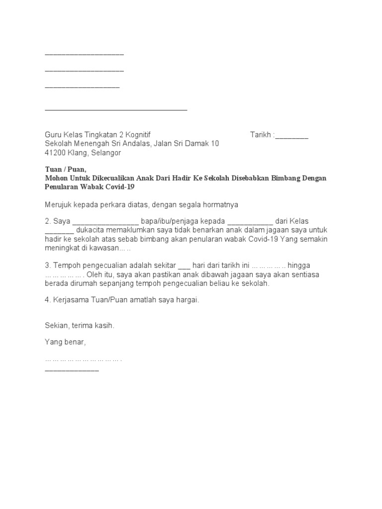 Contoh Surat Tidak Hadir Ke Sekolah Kerana Bimbang Covid 19