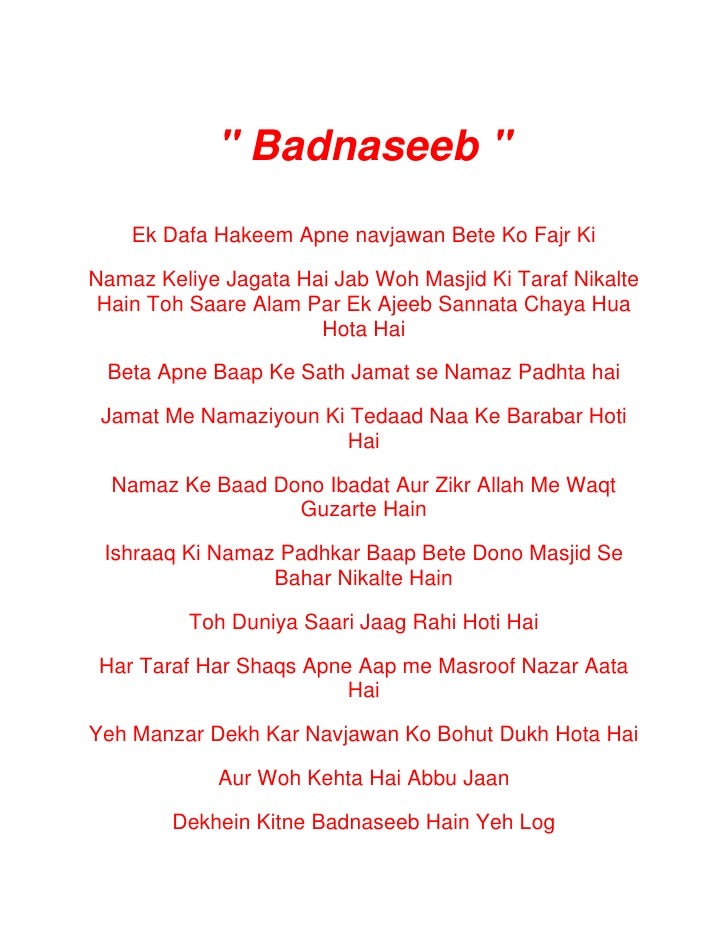 Examples Mera NASEEB hi kharab haijo question mujey aata tha galat ho gya. Zindagi imtihaan leti hai. There are always several meanings of each word in English the correct meaning of Badnaseeb in English is Hapless and in Urdu we write it بدنصیب.